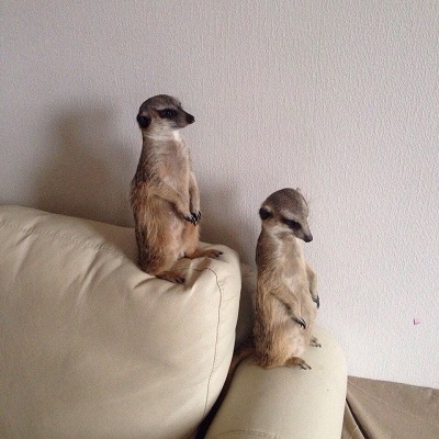 Сурикаты великолепно ладят с другими домашними животными, но только при условии, что сурикат у вас в доме один. Если вы купите сразу несколько зверьков, они объединятся в группу, которая будет бдительно и агрессивно защищать свою территорию от посторонних и тогда никакого мира между сурикатами и кошкой или собакой не будет.
